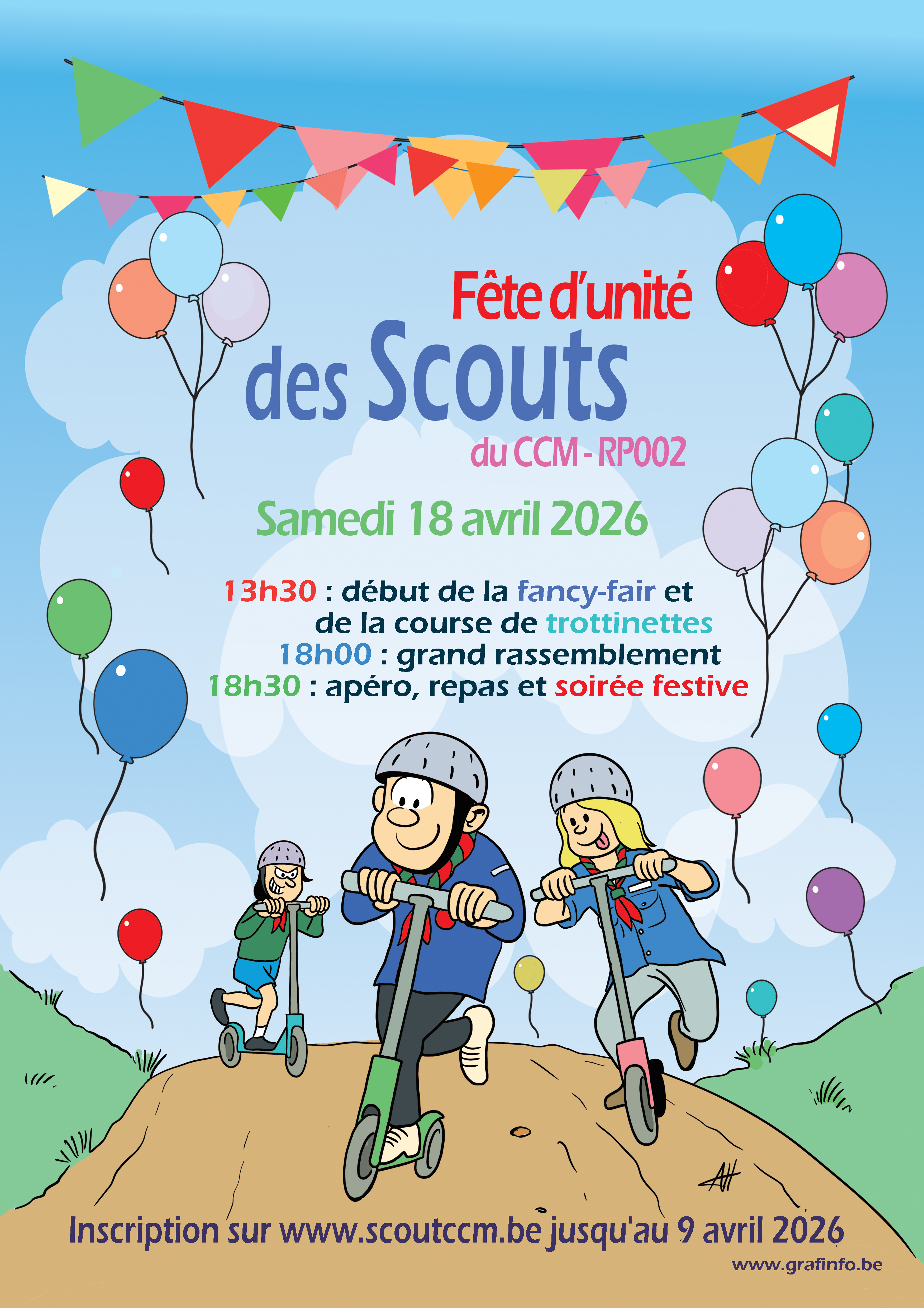 13h30: nous attendons vos enfants pour une après-midi festive de fancy-fair scoute. Au programme: stands, animations, jeux et course de trottinettes.